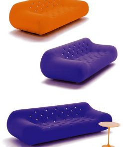 Диван. Структура: дерево, заполнение — полиуретановая пена с защитной тканью, кнопки – хромированная сталь, ножки – алюминий. Возможны другие варианты ткани и кожи.