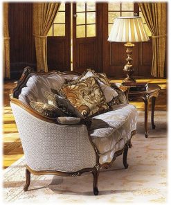 3-х местный диван, подлокотники с мягкими накладками. Наполнение — полиуретан. Декорирован резьбой. Ручная работа. Возможны различные варианты отделки (красное дерево, махагон, охра, декапе и т.д.) и обивки.