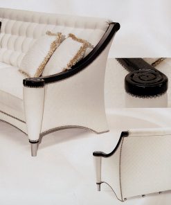 Трехместный диван с металлическими ножками и деревянными подлокотниками. Спинка обита в технике капитоне. Возможны другие варианты отделки и обивки.