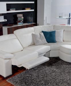 Модульный диван с деревянными ножками. Механизм с движением «нулевая стена» : ручной или дистанционный. Спинку можно наклонить, даже если находятся возле стены. Возможны другие варианты обивки, в том числе в ткани клиента.