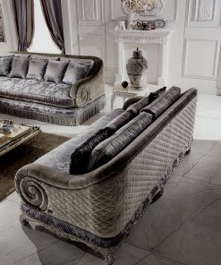 Трехместный диван-кровать с частично съемными чехлами. Спинка обита в технике капитоне. Декорирован резьбой. Возможна обивка с бахромой и классическим шнурком, другие варианты отделки и обивки, в том числе в ткани клиента.