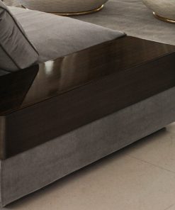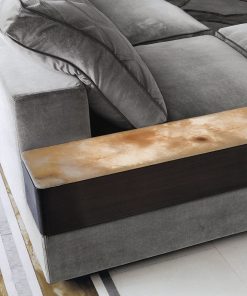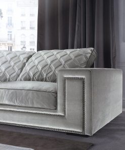Диван в мягкой обивке с широкими подлокотниками. Наполнение: гусиный пух, полиуретан. Подушки спинки декорированы ромбовидной прошивкой. Каркас декорирован металлическими заклёпками. Возможен вариант модульного дивана. Возможны друге варианты отделки и обивки. Дополнительно можно заказать элемент с металлическим каркасом и поверхностью из мрамора, оникса с подсветкой или дерева. Каркас также можно декорировать заклёпками из выбранной обивки