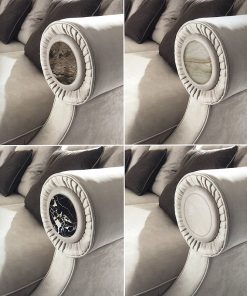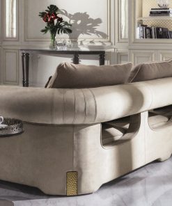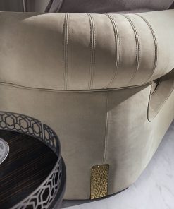 Диван в мягкой обивке с круглыми подлокотниками. Наполнение: гусиный пух, полиуретан. Декорирован вставками из литой латуни. Возможен вариант вставок из оникса, мрамора или в обивке в тон дивана. Возможен вариант модульного дивана. Возможны друге варианты отделки и обивки