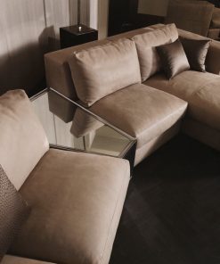 Пример композиции модульного дивана. Декорирован металлическими вставками. Включает в себя угловой столик с зеркальной столешницей и кушетку. Возможны другие варианты обивки