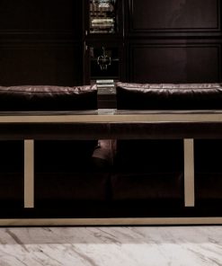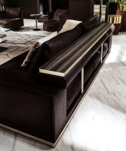 Диван в мягкой обивке. Спинка представляет собой металлический каркас с полкой. Поверхность полки может быть выполнена из мрамора, оникса с подсветкой или дерева. Наполнение: полиуретан. Основание выполнено из металла. Возможны другие варианты отделки и обивки
