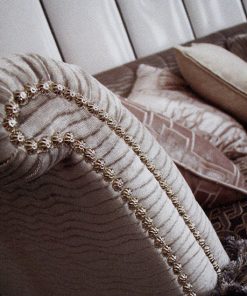 Полукруглый диван с резными ножками. Спинка и подлокотники обиты в технике капитоне. Декорирован металлическими элементами. Возможны другие варианты отделки и обивки.