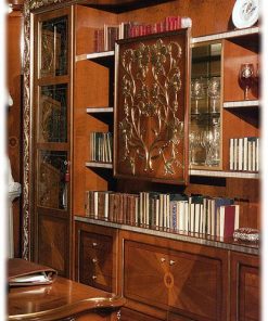 Книжный шкаф с открытыми и закрытыми полками, и выдвижными ящиками. Декорирован резными элементами, стекла с декоративным рисунком. Возможны другие варианты отделки.