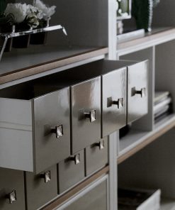 Модульный книжный шкаф с распашными дверцами, выдвижными ящиками и открытыми полками. Структура — липа. Возможны другие варианты отделки.