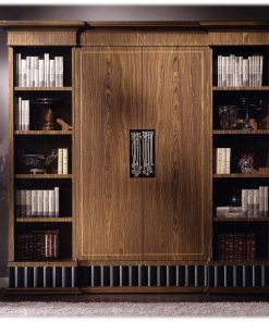Книжный шкаф с 2-мя распашными дверцами и открытыми полками. Дверцы открываются на 180 градусов, при этом можно закрыть центральную часть шкафа или 2 боковых элемента. Структура — палисандровое дерево. Дверцы декорированы инкрустацией. Возможны другие варианты отделки.