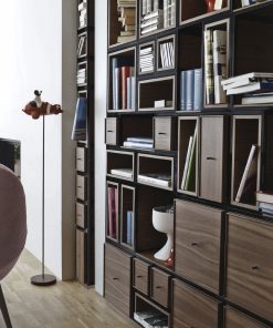 Пример композиции модульного книжного шкафа с открытыми полками и выдвижными ящиками. Каркас выполнен из металла. Возможны другие варианты отделки. Составляется по желанию заказчика
