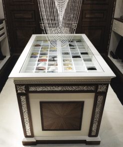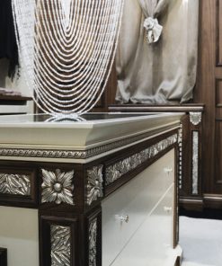 Двусторонний комод с шестью выдвижными ящиками и верхним отделением для аксессуаров. Декорирован инкрустацией и резьбой. Возможны другие варианты отделки