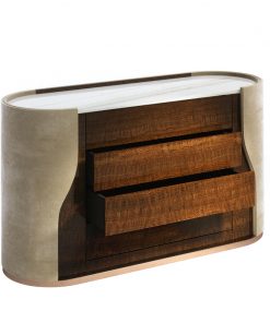 Комод с четырьмя выдвижными ящиками и мраморной столешницей. Боковины обиты кожей. Основание выполнено из металла. Возможны другие варианты отделки и обивки