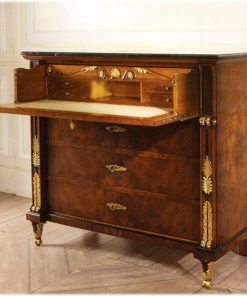 Комод с 3-мя ящиками и секретером. Столешница выполнена из мрамора, столешница секретера выполнена из кожи. Отделка — радика калифорнийского ореха. Декорирован резными элементами ручной работы.