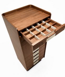 Комод с выдвижными ящиками, откидной дверцей и 15 внутренними ящиками в обивке из кожи. Возможны другие варианты отделки и обивки.