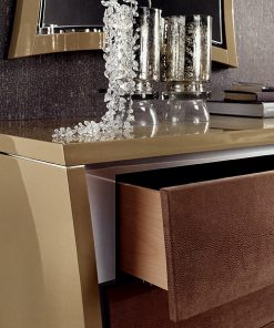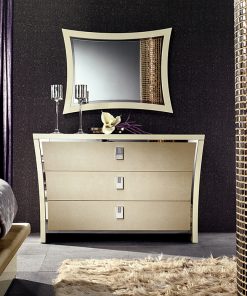Комод с тремя выдвижными обшитыми ящиками с металлическими ручками. Структура с лакированной отделкой и вставками из блестящего хромированного металла. Возможны другие варианты отделки и обивки.