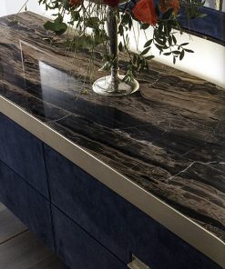 Комод с четырьмя выдвижными ящиками, металлической рамой и мраморной столешницей. Оснащён подсветкой. Основание обито кожей. Возможен вариант с деревянным основанием. Столешница может быть зеркальной, деревянной или из крашенного хрусталя. Возможны другие варианты отделки и обивки