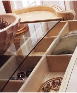 Комод с 5-ю выдвижными ящиками. Столешница выполнена из стекла. Декорирован резьбой. Возможны различные варианты отделки.