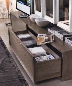Пример композиции для гостиной. Включает в себя два модуля с выдвижными ящиками, три подвесных модуля со стеклянными дверцами и две подвесные полки. Возможны другие варианты отделки. Стёкла могут быть дымчатыми или прозрачными