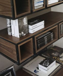Пример композиции для гостиной. Включает в себя тумбу под TV с пятью выдвижными ящиками и два подвесных модуля с открытыми полками. Каркас выполнен из металла. Возможны другие варианты отделки