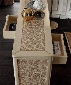 Консоль с выдвижными ящиками с двух сторон и открытыми полками. Декорирована резьбой. Возможны другие варианты отделки.