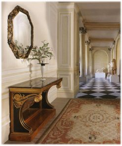 Консоль с состаренной зеркальной панелью. Столешница выполнена из мрамора. Отделка — радика мирта. Декорирована резными элементами ручной работы.