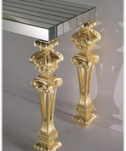 Консоль, ножки декорированы резьбой. Столешница выполнена в отделке из зеркала, также можно выполнить из черного или перламутрового стекла. Возможны другие варианты отделки.
