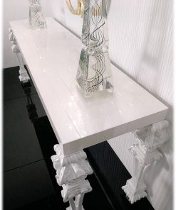 Консоль, ножки декорированы резными элементами. Столешница выполнена из стекла, также можно выполнить из зеркала. Возможны другие варианты отделки.