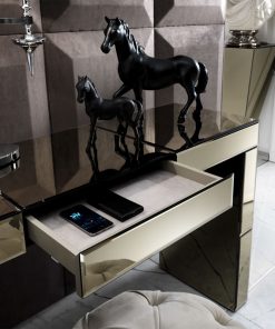 Консоль в зеркальной отделке с прямоугольной столешницей и выдвижным ящиком. Возможен вариант консоли в отделке из дерева. По запросу возможно выполнение в нестандартных размерах