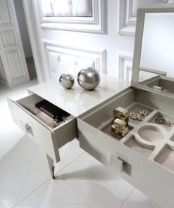 Консоль с тремя выдвижными ящиками, откидной столешницей с внутренним зеркалом и фигурными металлическими ножками. Возможны другие варианты отделки
