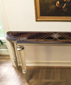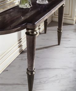 Консоль с фигурной мраморной столешницей и четырьмя фигурными металлическими ножками. Основание и вставки на ножках обиты кожей. Возможен вариант вставок из оникса или мрамора. Возможен вариант основания без обивки. Столешница может быть выполнена из эбенового дерева и декорирована инкрустацией. Возможны друге варианты отделки и обивки