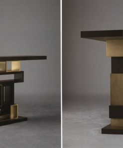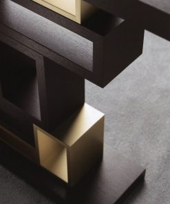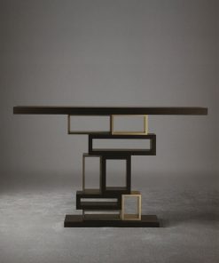 Консоль с прямоугольной деревянной столешницей и основанием. Центральная часть выполнена из панелей разных размеров в отделке из металла и дерева. Возможны другие варианты отделки