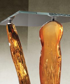 Консоль с прямоугольной стеклянной столешницей и деревянным основанием. Декорирована двумя фигурными опорами из муранского стекла. Возможны другие варианты отделки