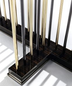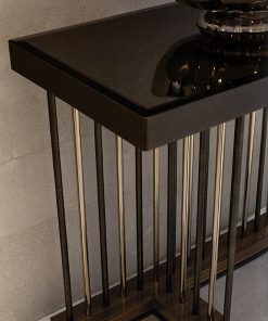 Консоль с металлическим основанием и прямоугольной зеркальной столешницей. Металлические стержни основания крепятся к базе из дерева. Столешница может быть деревянной, мраморной или из крашенного хрусталя. Возможны другие варианты отделки