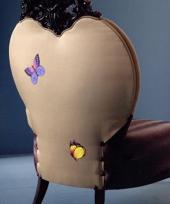 Детское кресло, декорированное резьбой. Наполнение — полиуретан. Ткань расписана вручную. Возможны различные варианты отделки и обивки, в том числе выполнение в ткани клиента.