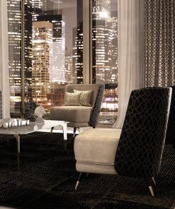 Кресло с закруглённой спинкой. Декорировано металлическими деталями на ножках. Наполнение: пенополиуретан. Возможны другие варианты отделки и обивки. Декоративные подушки заказываются дополнительно
