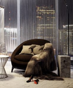 Кресло с закруглённой спинкой и подлокотниками. Наполнение: пенополиуретан. Возможны другие варианты отделки и обивки. Декоративные подушки заказываются дополнительно