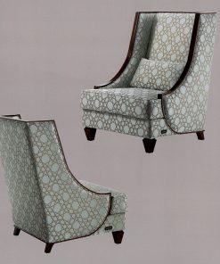 Обитое кресло с деревянными ножками и высокой спинкой. Возможны другие варианты отделки и обивки.