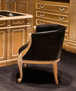 Кресло, низкая спинка расположена на одном уровне с подлокотниками. Наполнение — полиуретан. Возможны другие варианты отделки и обивки.