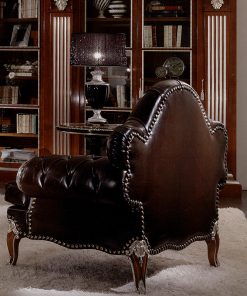 Кресло. Декорировано резьбой. Спинка и подлокотники обиты в технике капитоне. Возможны другие варианты отделки и обивки, в том числе в коже клиента.
