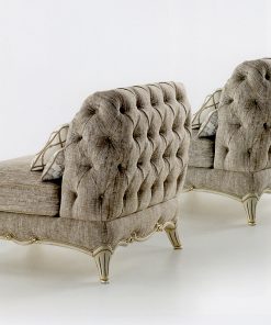 Кресло без подлокотников, с резным основанием. Спинка обита в технике капитоне. Возможны другие варианты отделки и обивки.