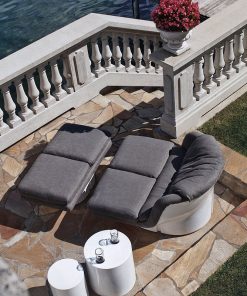 Кресло в мягкой обивке с круглым основанием. Предназначено для использования вне помещений. Каркас выполнен из стекловолокна. Наполнение: полиуретан. Обивка подушек полностью съёмная. Возможны другие варианты отделки и обивки