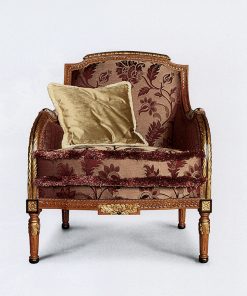 Обитое кресло с деревянными ножками. Декорировано резьбой. Возможны другие варианты отделки и обивки, в том числе в ткани клиента.