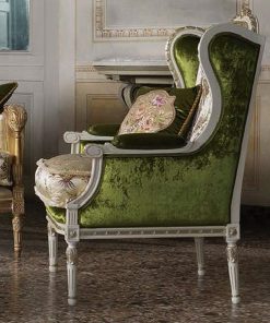 Кресло. Украшено резьбой. Спинка обита в технике капитоне. Возможен вариант без капитоне и другие варианты обивки.