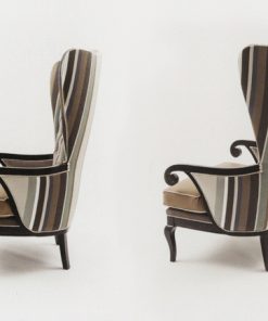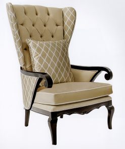 Кресло с подлокотниками, мягким сидением и высокой спинкой, обитой в технике капитоне. Возможны другие варианты отделки и обивки, в том числе в ткани клиента.