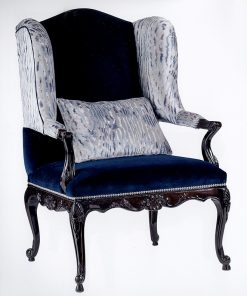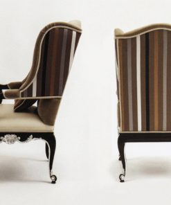 Кресло с подлокотниками, мягким сидением и спинкой. Декорировано резьбой. Возможны другие варианты отделки и обивки, в том числе в ткани клиента.