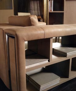 Кресло в мягкой обивке. Декорировано металлическими вставками на подлокотниках. По бокам кресла установлены деревянные полочки. Возможны другие варианты обивки