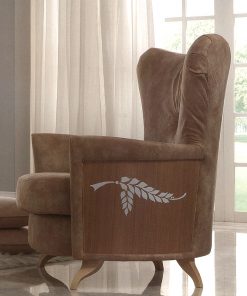 Кресло в мягкой обивке с деревянными боковинами, декорированными росписью. Возможны другие варианты отделки и обивки