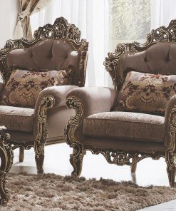 Кресло с мягкими подлокотниками, сиденьем и спинкой, обитой в технике капитоне. Декорировано резьбой