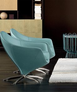 Кресло с закругленной спинкой плавно переходящей в подлокотники. Вращающаяся основа. Наполнение — недеформируемая синтетическая резина. Возможны другие варианты обивки.