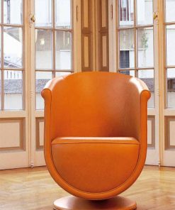 Вращающееся кресло, низкая спинка плавно переходит в подлокотники. Наполнение — полиуретан. Возможны другие варианты обивки.